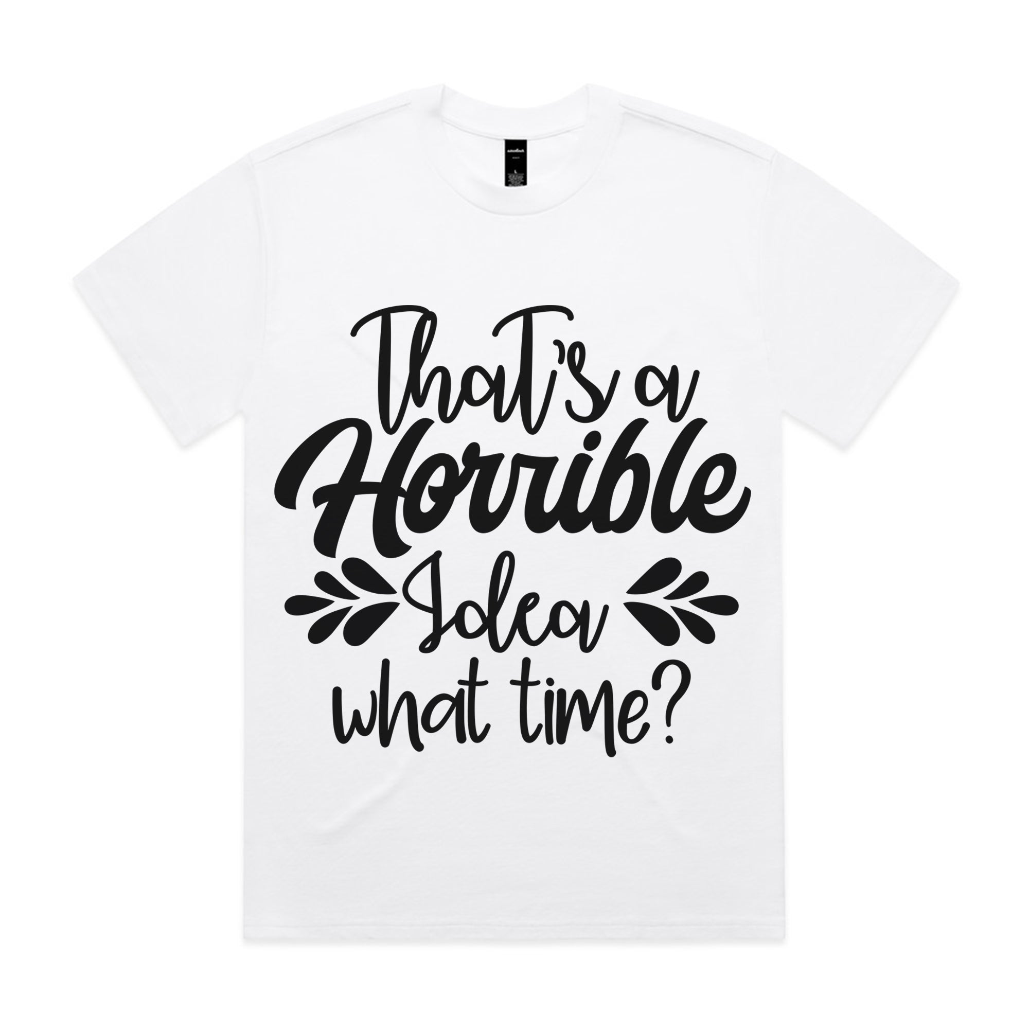 Get ready for spontaneous fun with this witty graphic tee! Featuring the hilarious phrase “That’s a Horrible Idea, What Time?”, this shirt is perfect for those who love saying yes to wild plans (even when they know better).
