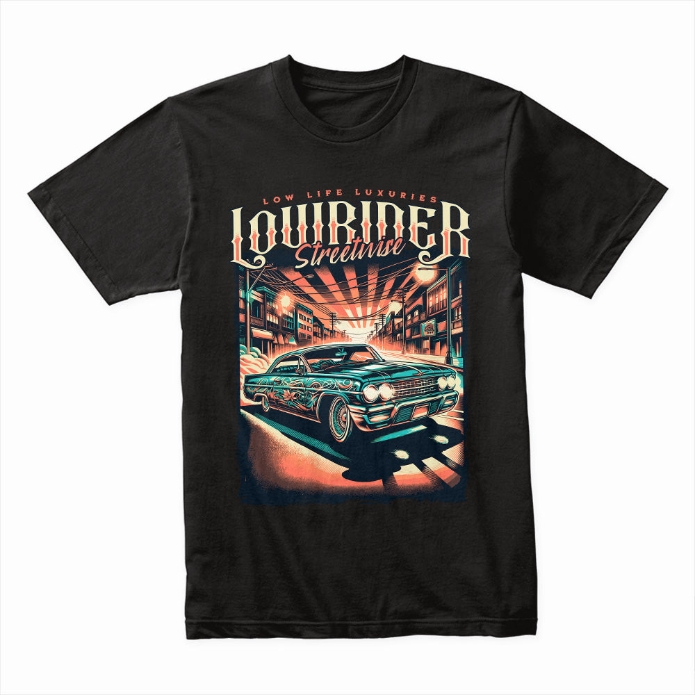 Feel the rhythm of the streets with the Lowrider Streetwise T-Shirt. Featuring a classic lowrider cruising under city lights with vibrant retro colors, this design blends urban attitude, vintage style, and the smooth vibe of lowrider culture.