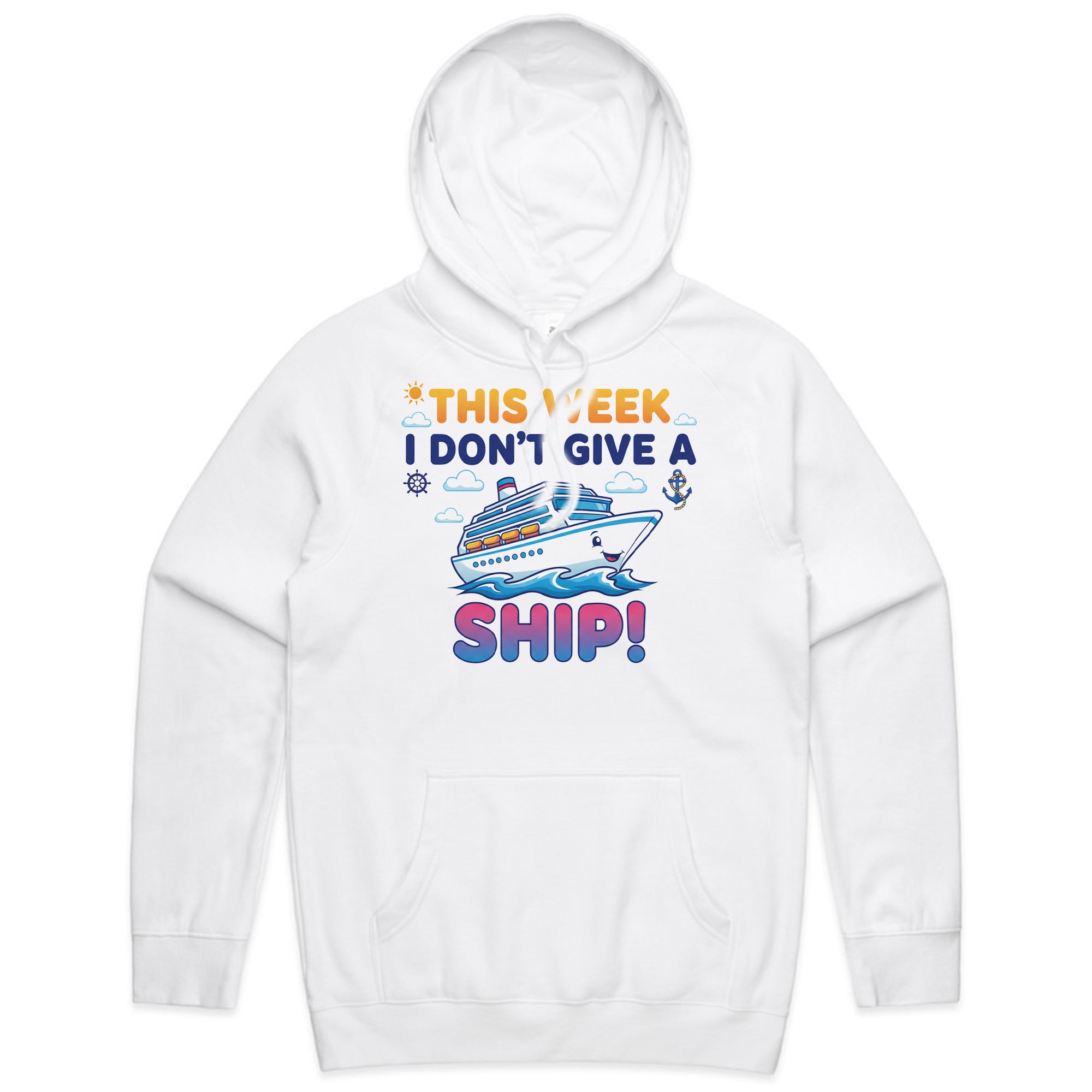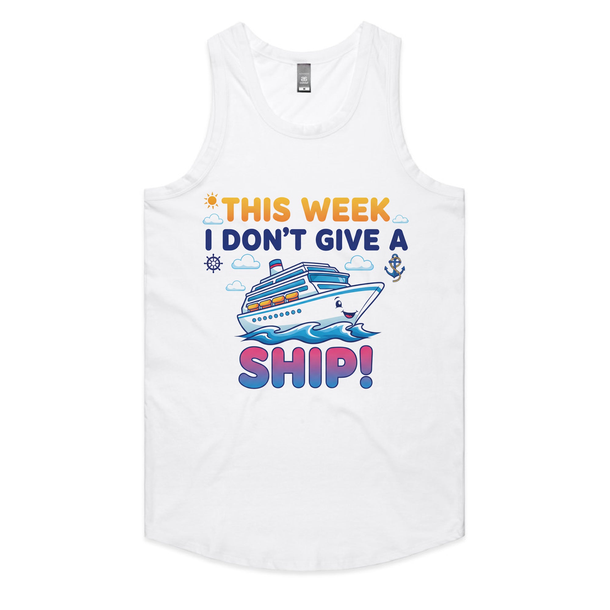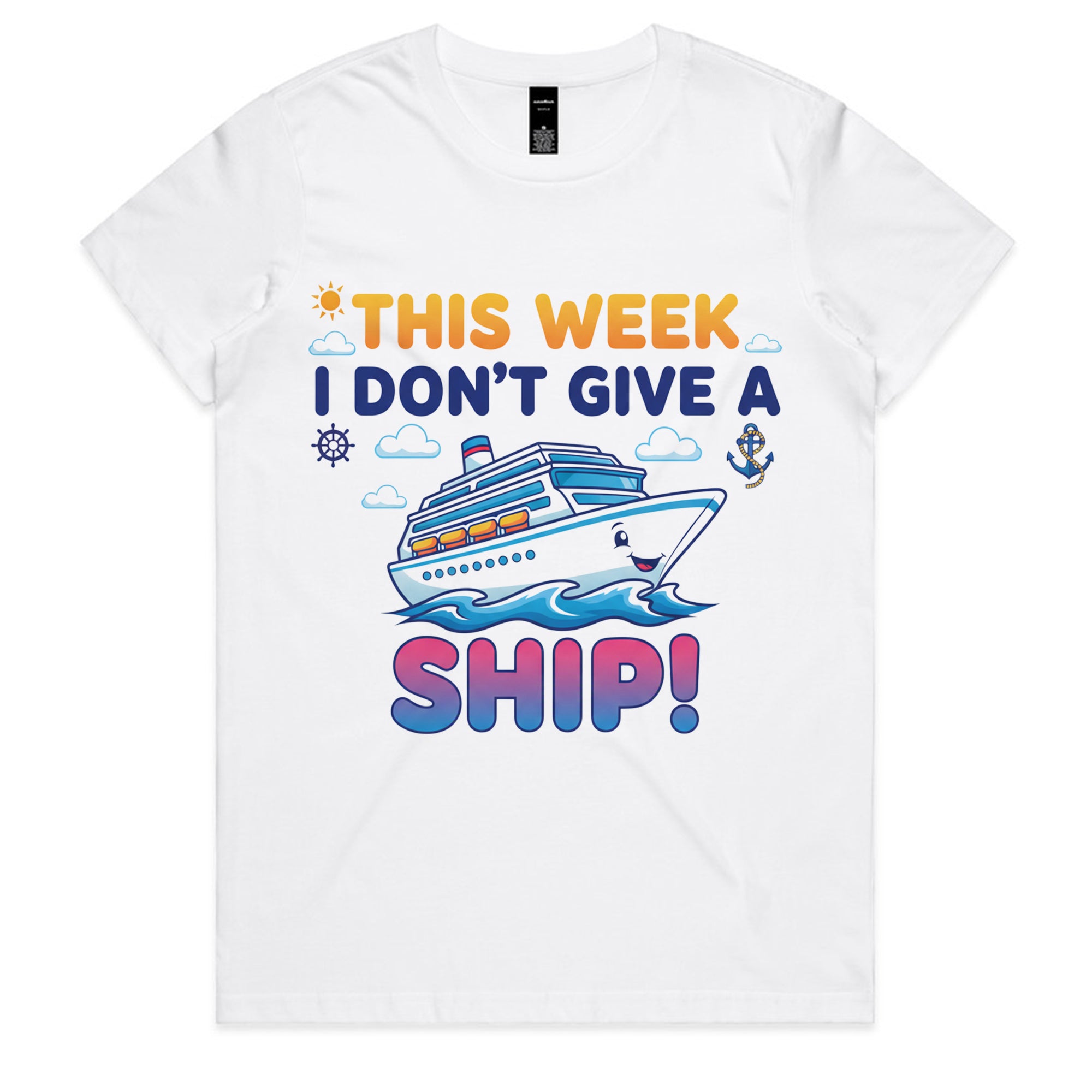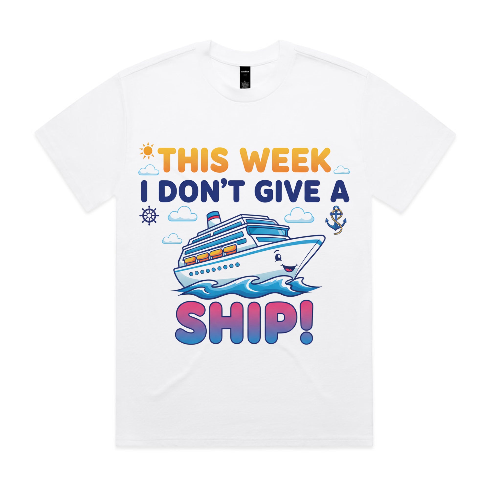 Fun, carefree, and a little cheeky! This tee features a smiling cartoon cruise ship and playful typography that says it all. Ideal for vacationers who just want to relax, unplug, and not care about anything but ocean breezes.
