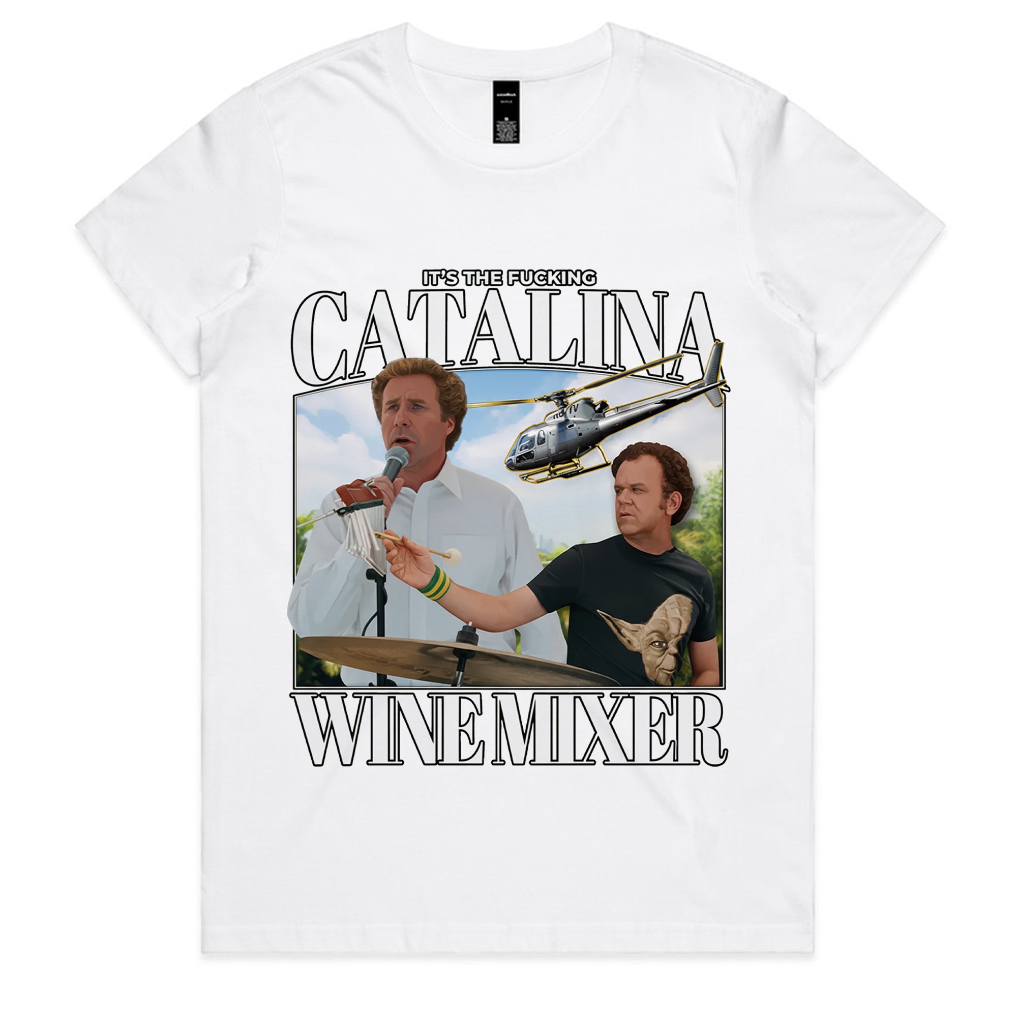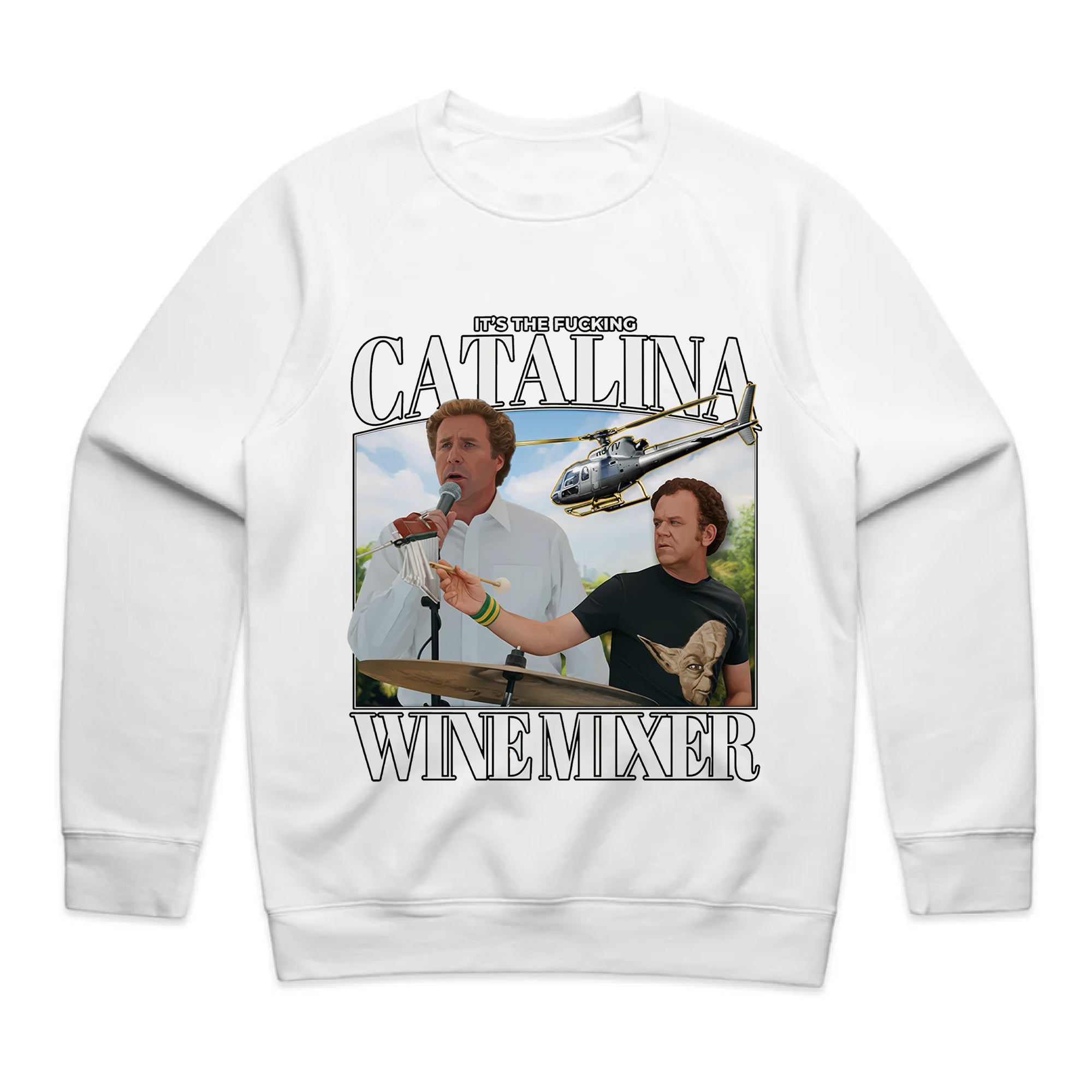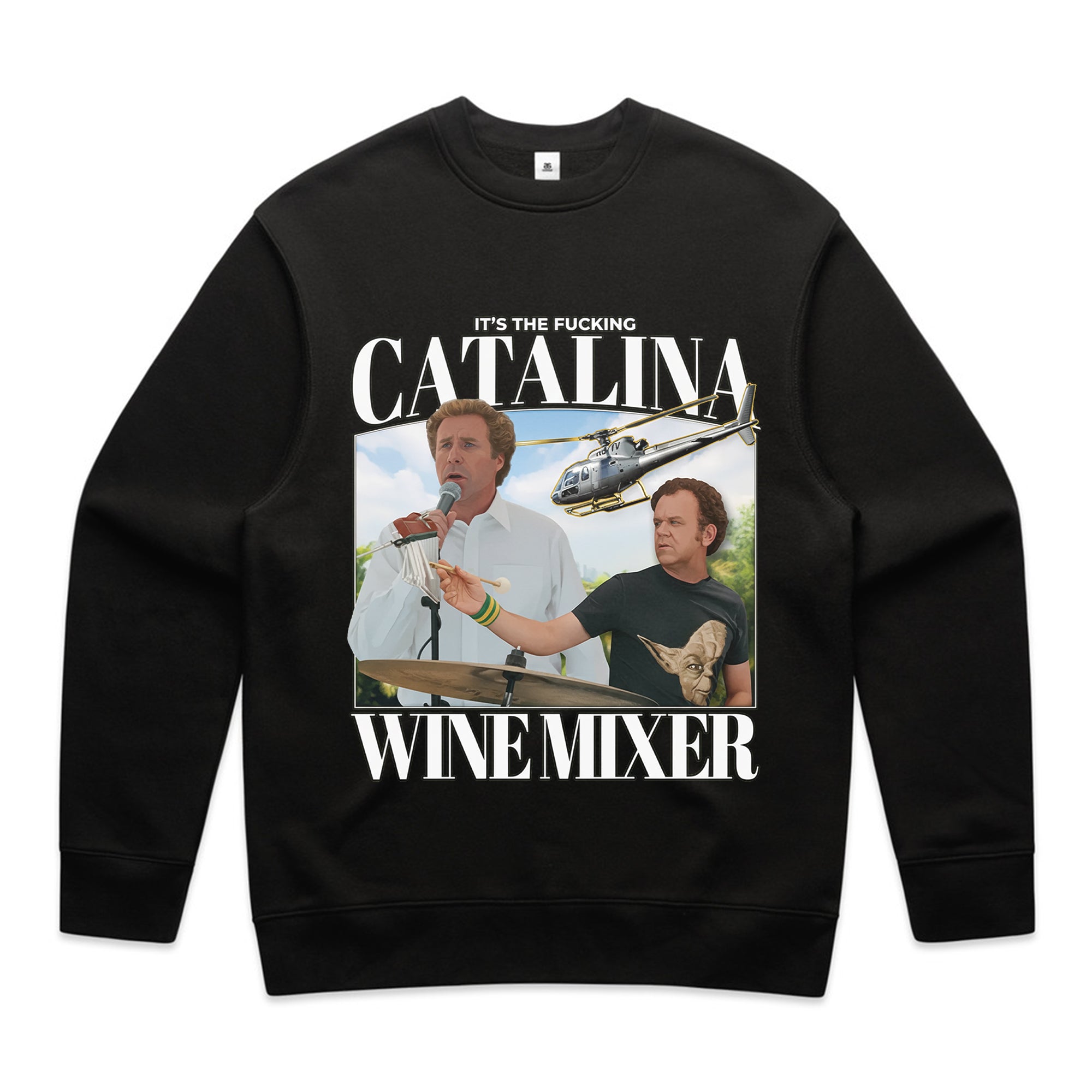 A cinematic tribute design featuring a rectangular still of the characters Dale and Brennan from the movie Step Brothers. It includes a helicopter in the background and the iconic "CATALINA WINE MIXER" text in an outlined serif font.