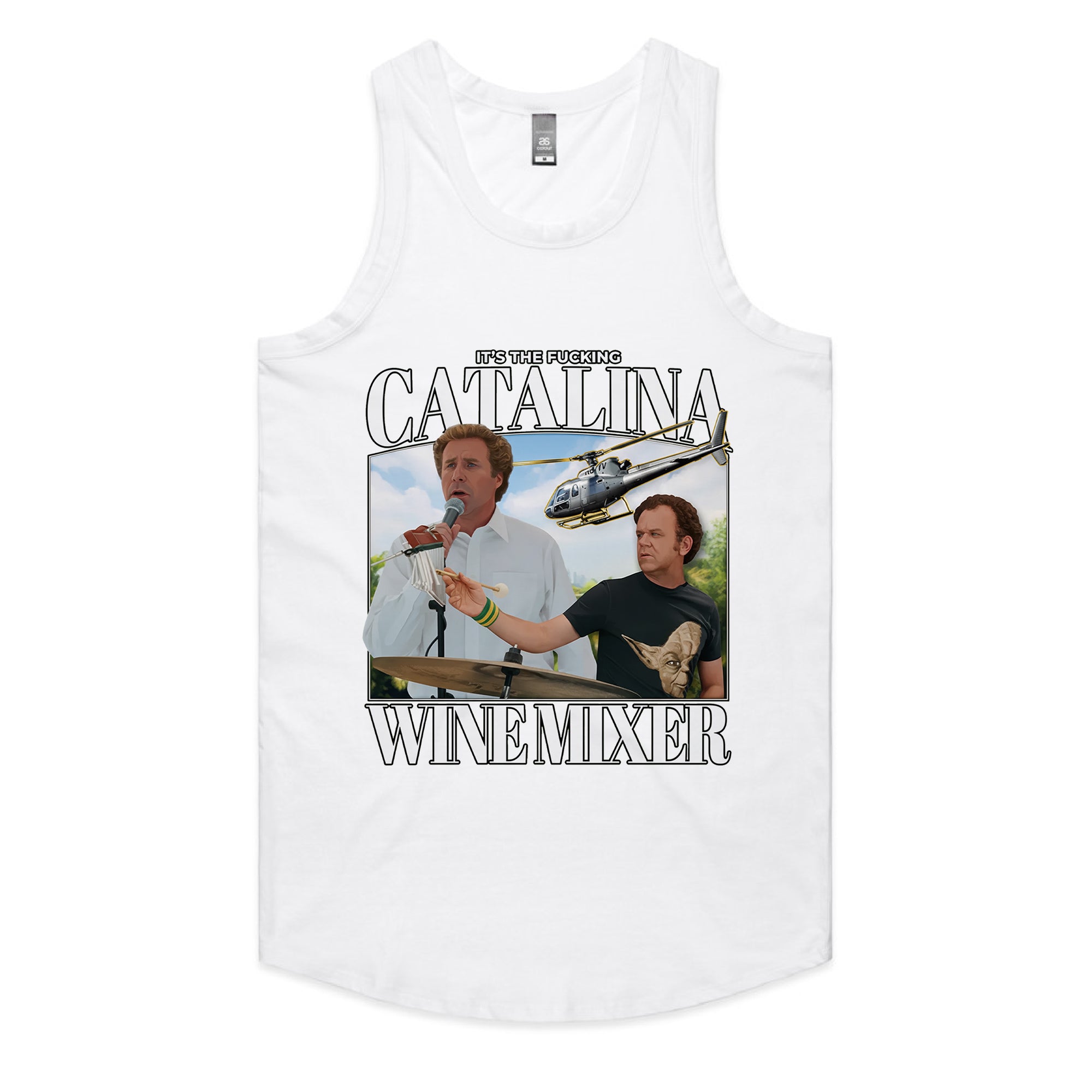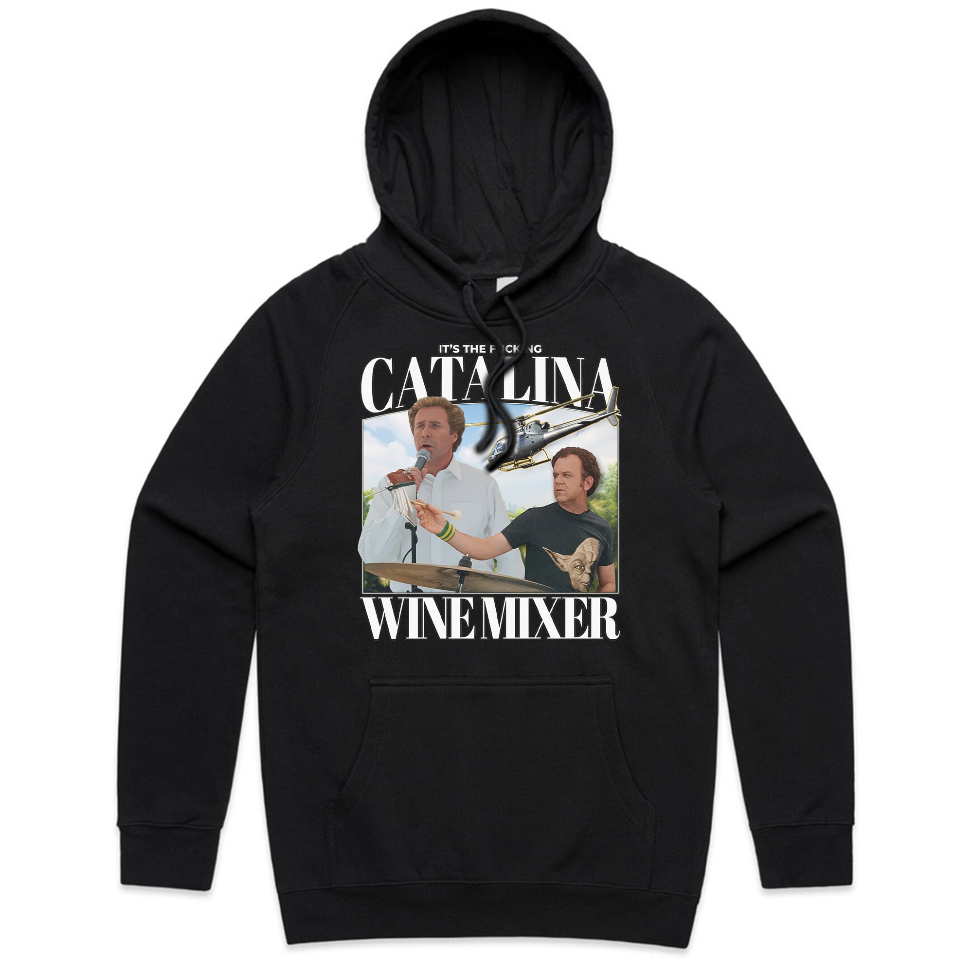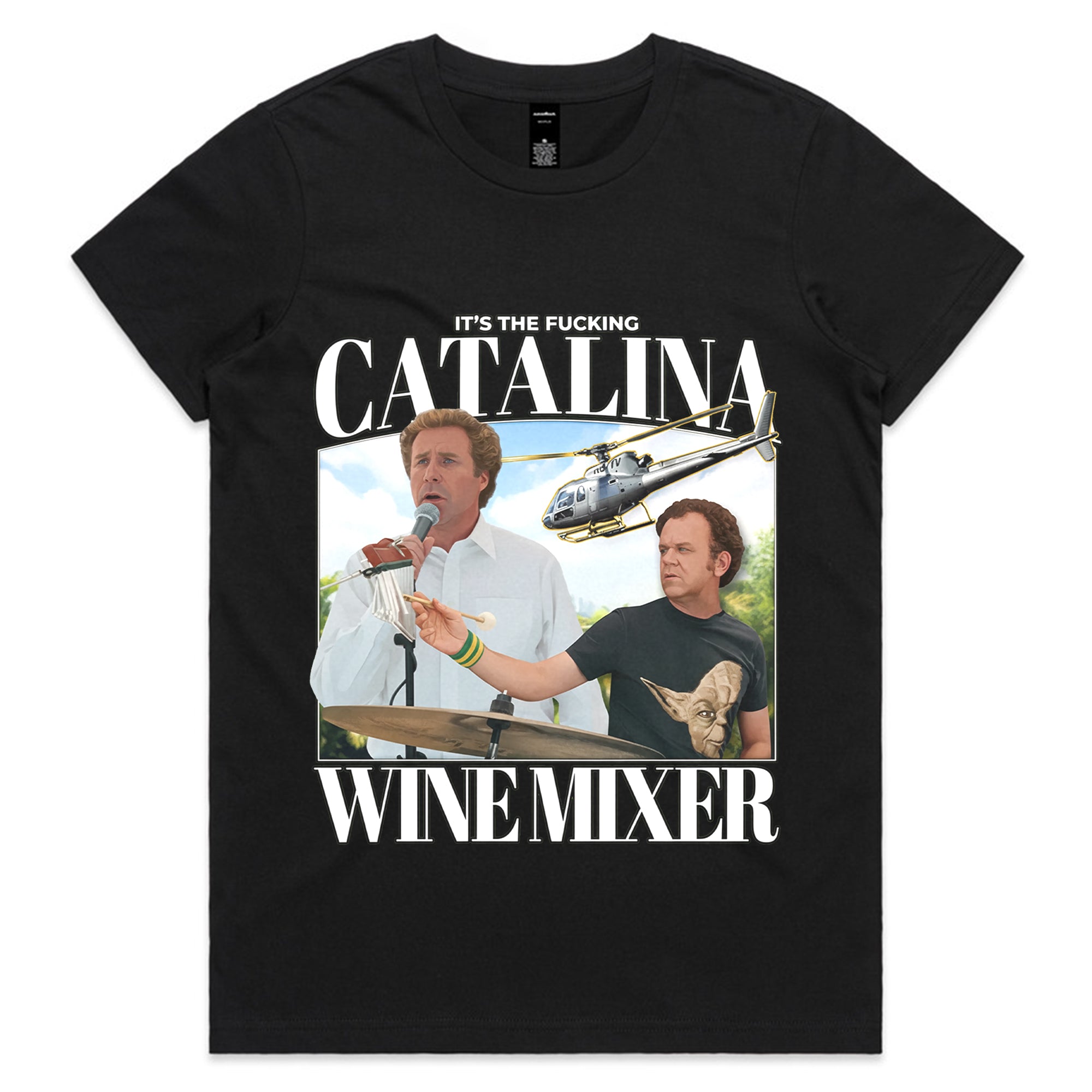 A cinematic tribute design featuring a rectangular still of the characters Dale and Brennan from the movie Step Brothers. It includes a helicopter in the background and the iconic "CATALINA WINE MIXER" text in an outlined serif font.