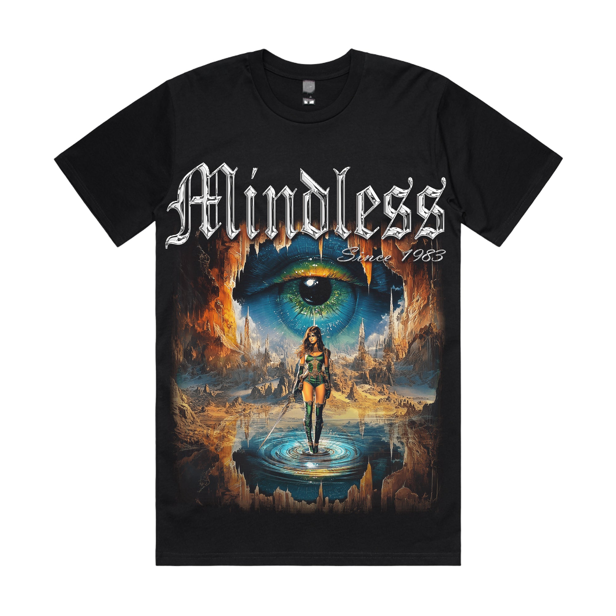 Step into a world beyond reality with the "Cyber Valkyrie Eye" T-shirt — a surreal fusion of sci-fi fantasy, mythic guardians, and cosmic vision. This design features a futuristic warrior queen emerging from a glowing portal, beneath a massive all-seeing eye carved into a burning canyon. Behind her unfolds a shattered landscape of flame, stone, and illusion — where time and space collapse into the void. The bold gothic “Mindless – Since 1983” typography anchors the design in vintage heavy metal aesthetics, balancing chaos and beauty in equal force.
