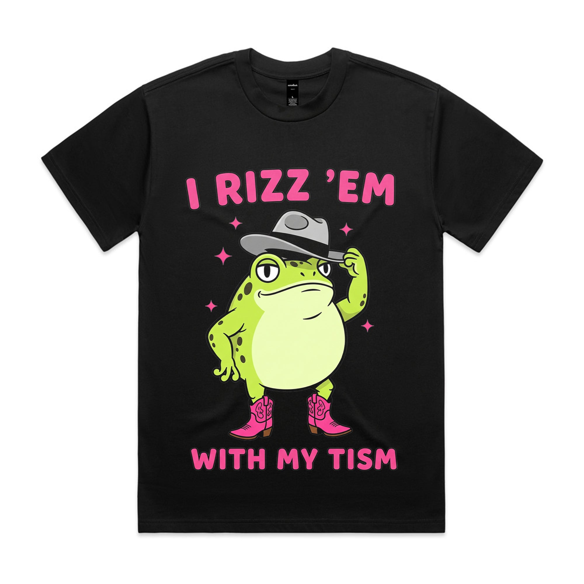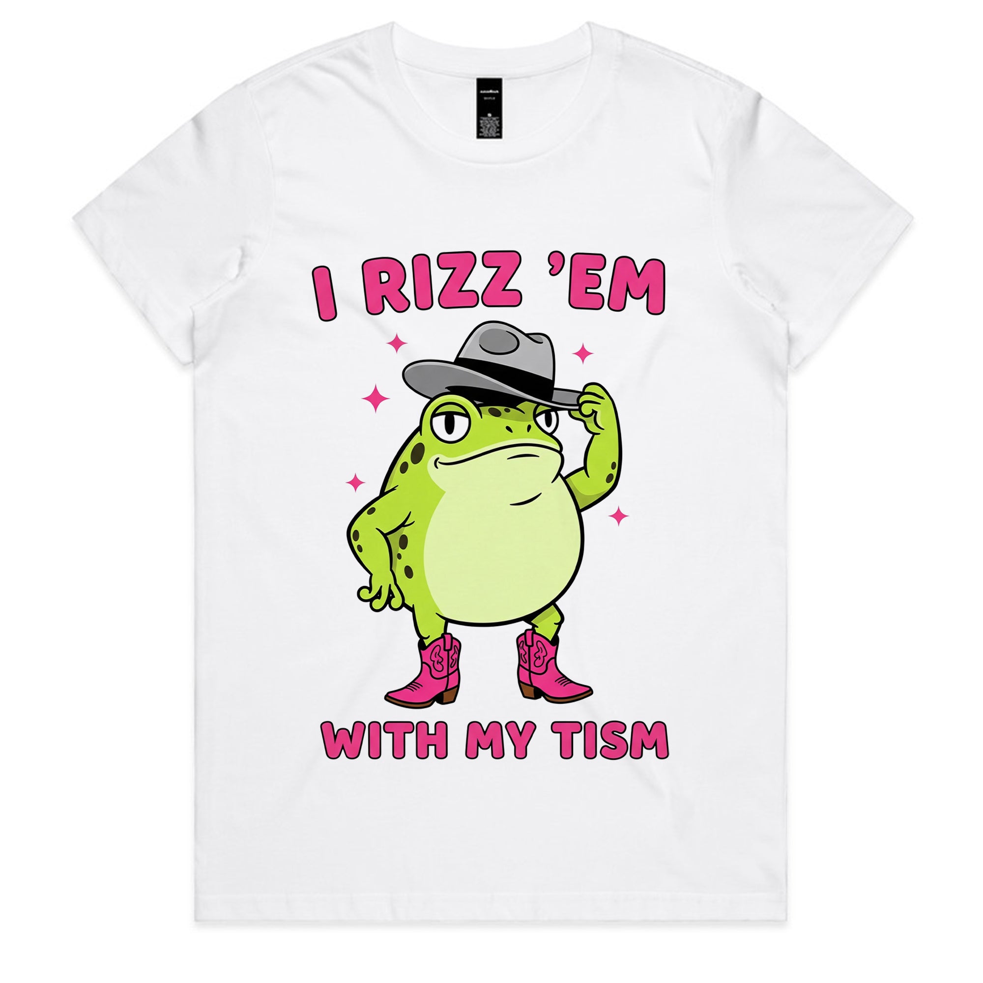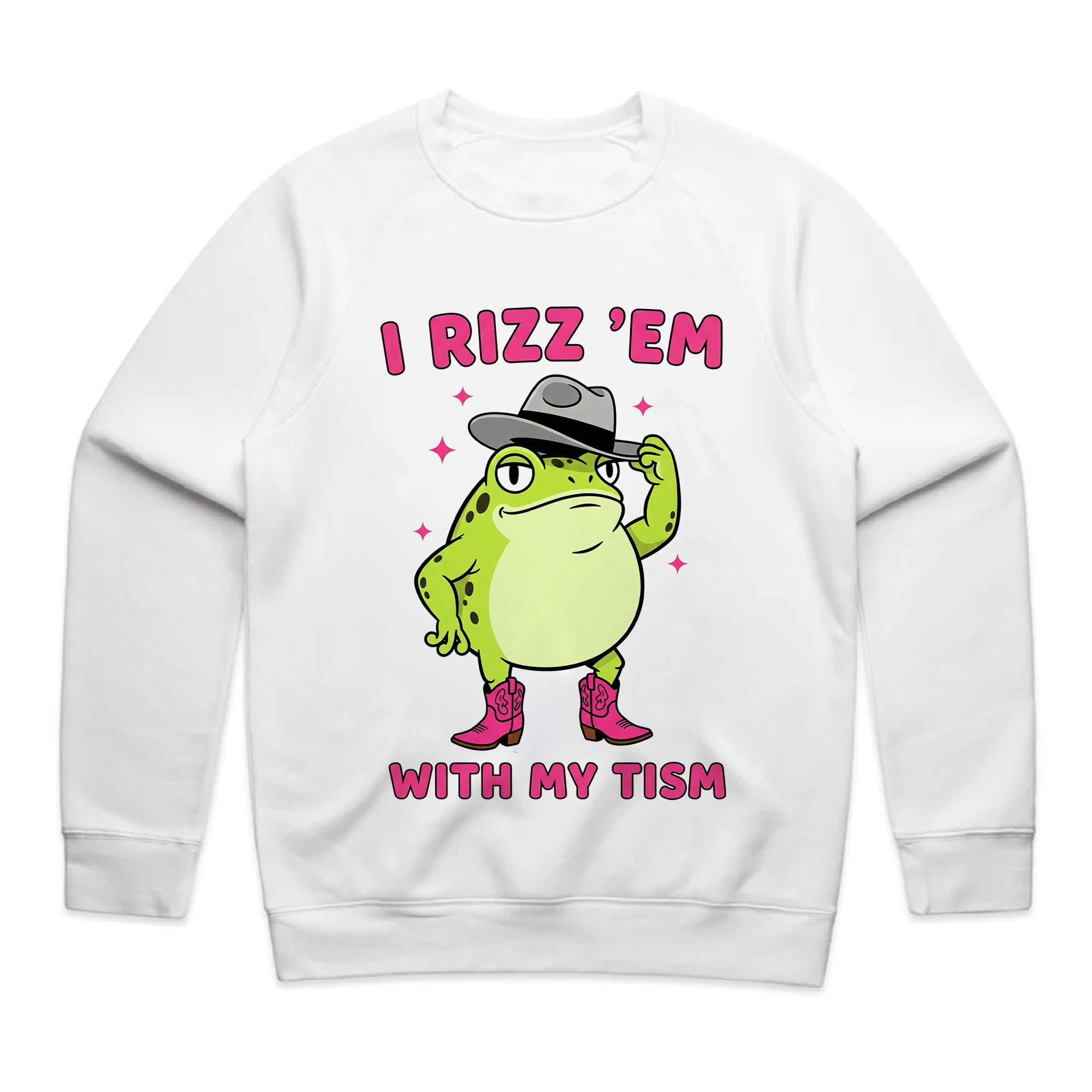 This playful design features a confident cartoon frog tipping his hat and wearing pink cowboy boots. Surrounded by sparkles, the text “I Rizz ’Em With My Tism” mixes internet slang with humor for a quirky, confident look.