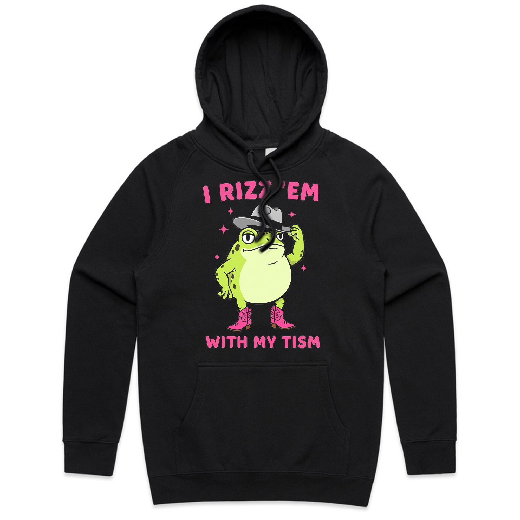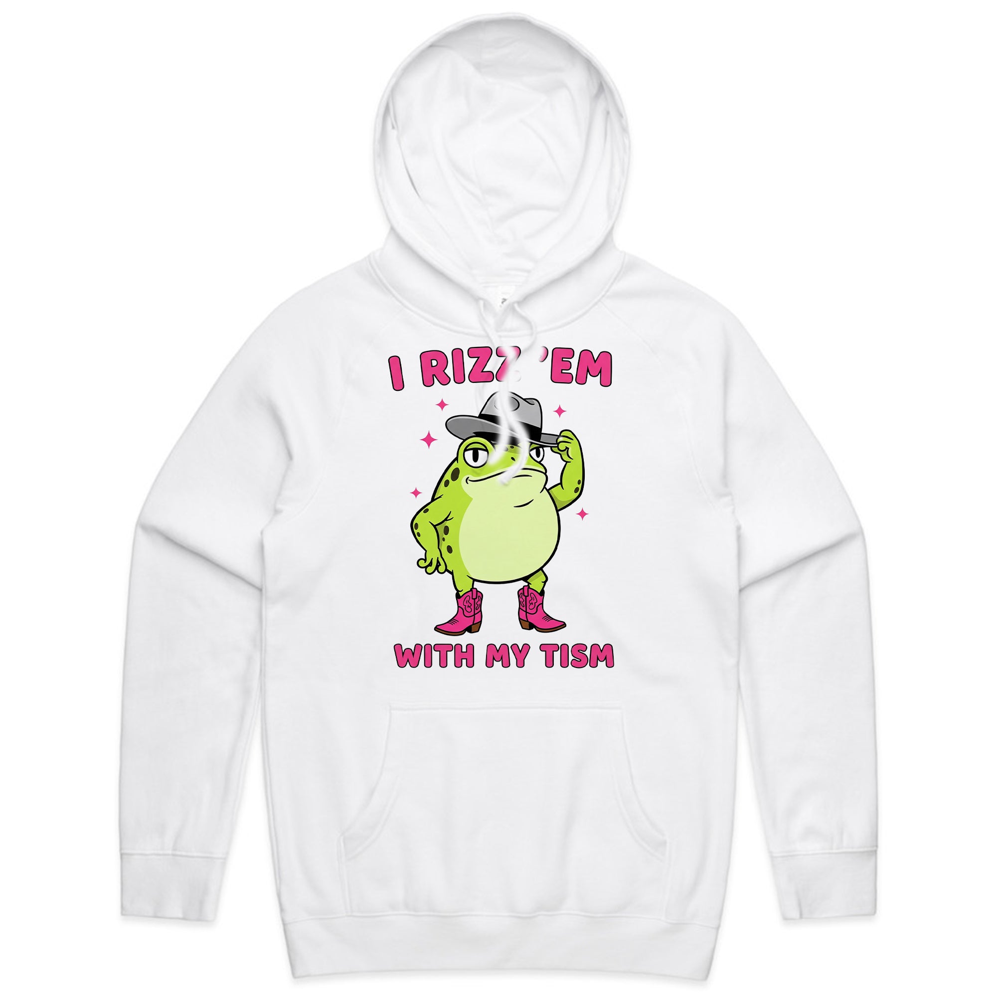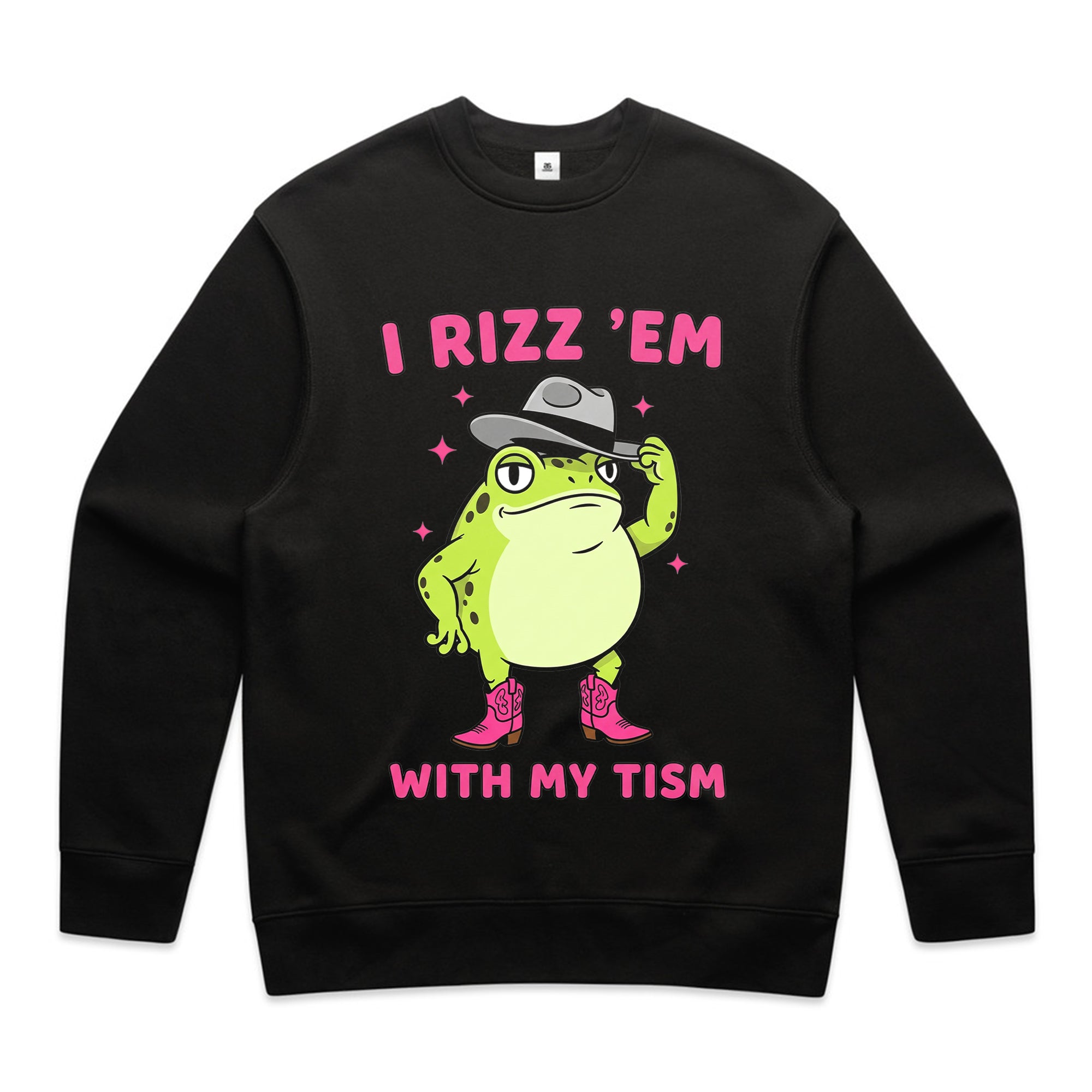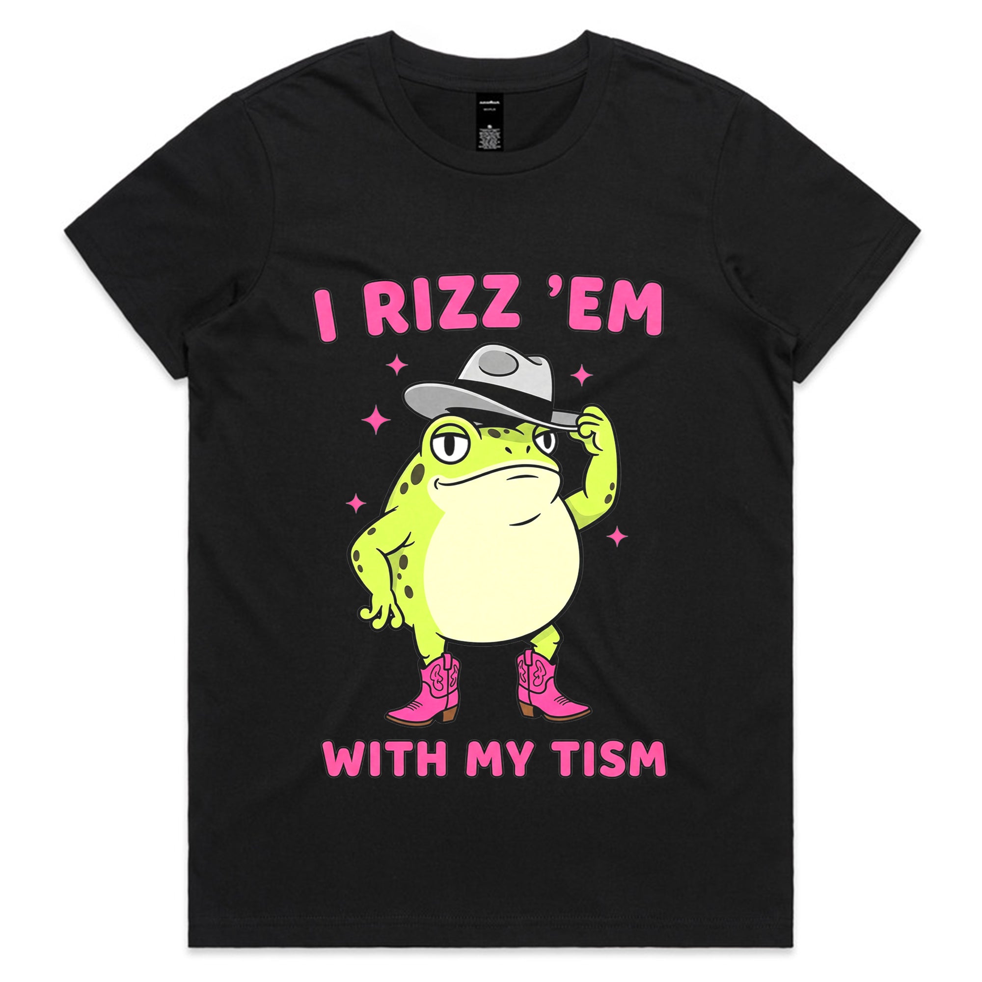 This playful design features a confident cartoon frog tipping his hat and wearing pink cowboy boots. Surrounded by sparkles, the text “I Rizz ’Em With My Tism” mixes internet slang with humor for a quirky, confident look.