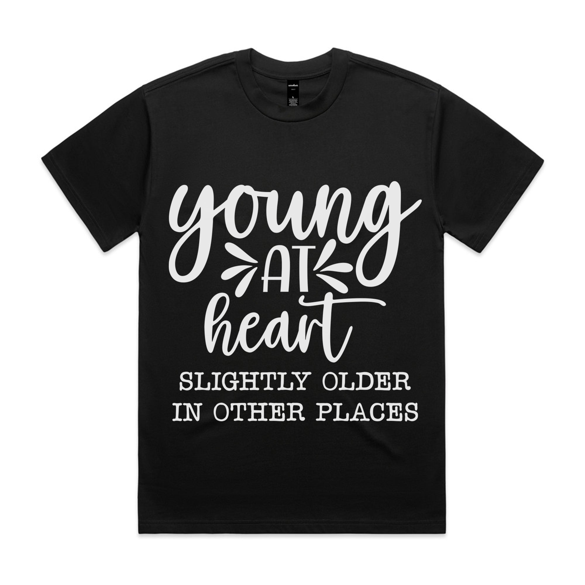 Keep the laughs coming with this witty graphic tee! Featuring the playful phrase “Young at Heart, Slightly Older in Other Places”, this shirt is perfect for anyone who embraces aging with a sense of humor.