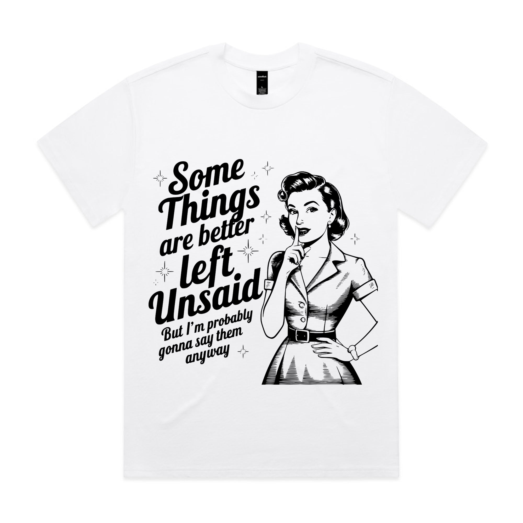 Bring vintage sass with this retro-inspired graphic tee! Featuring a stylish pin-up style illustration and the witty phrase “Some Things Are Better Left Unsaid – But I’m Probably Gonna Say Them Anyway”, this shirt is made for those who can’t help speaking their mind.