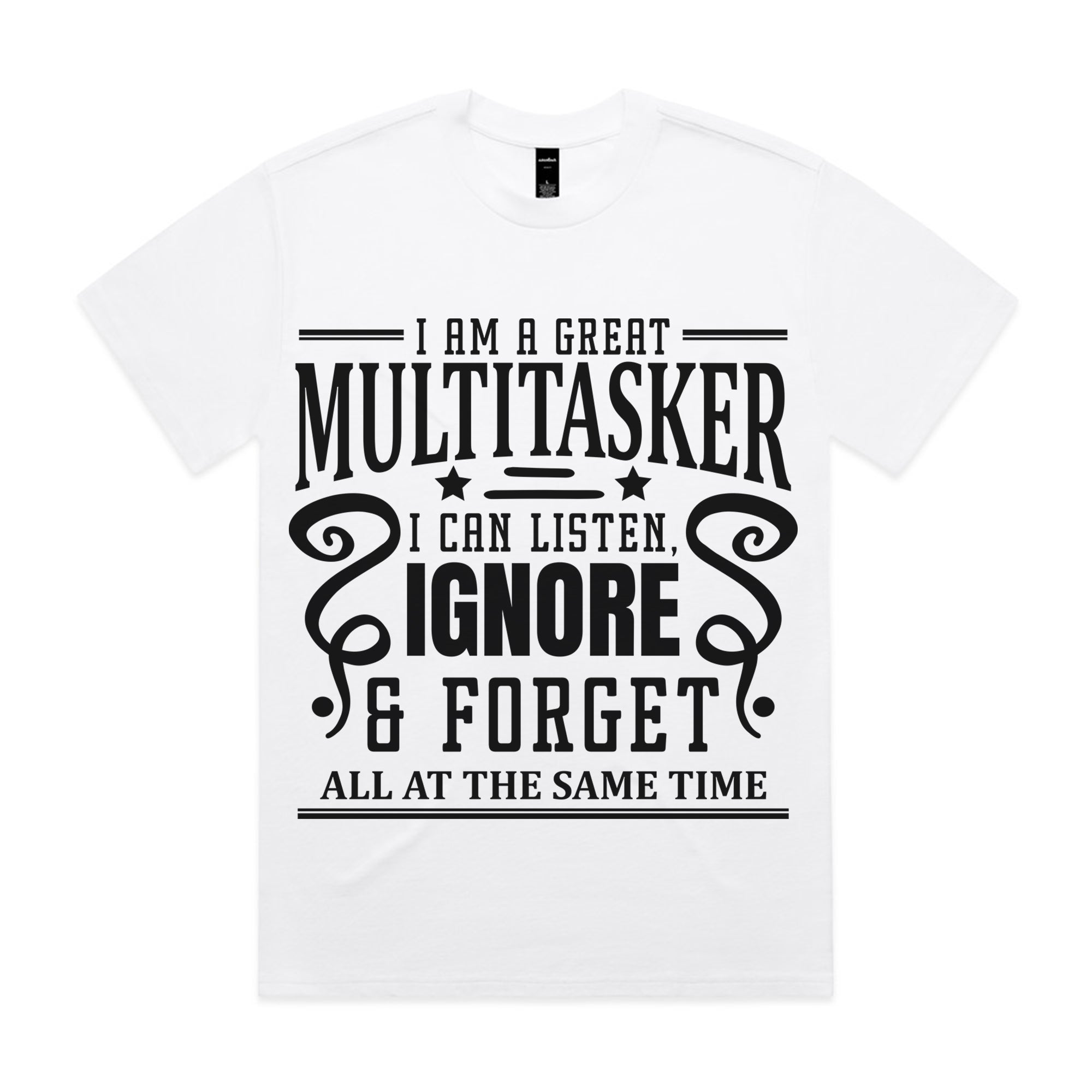 Show off your true multitasking skills with this witty black tee: “I am a great multitasker. I can listen, ignore & forget all at the same time.” Featuring bold white typography with stylish design accents, this shirt perfectly balances humor and attitude.